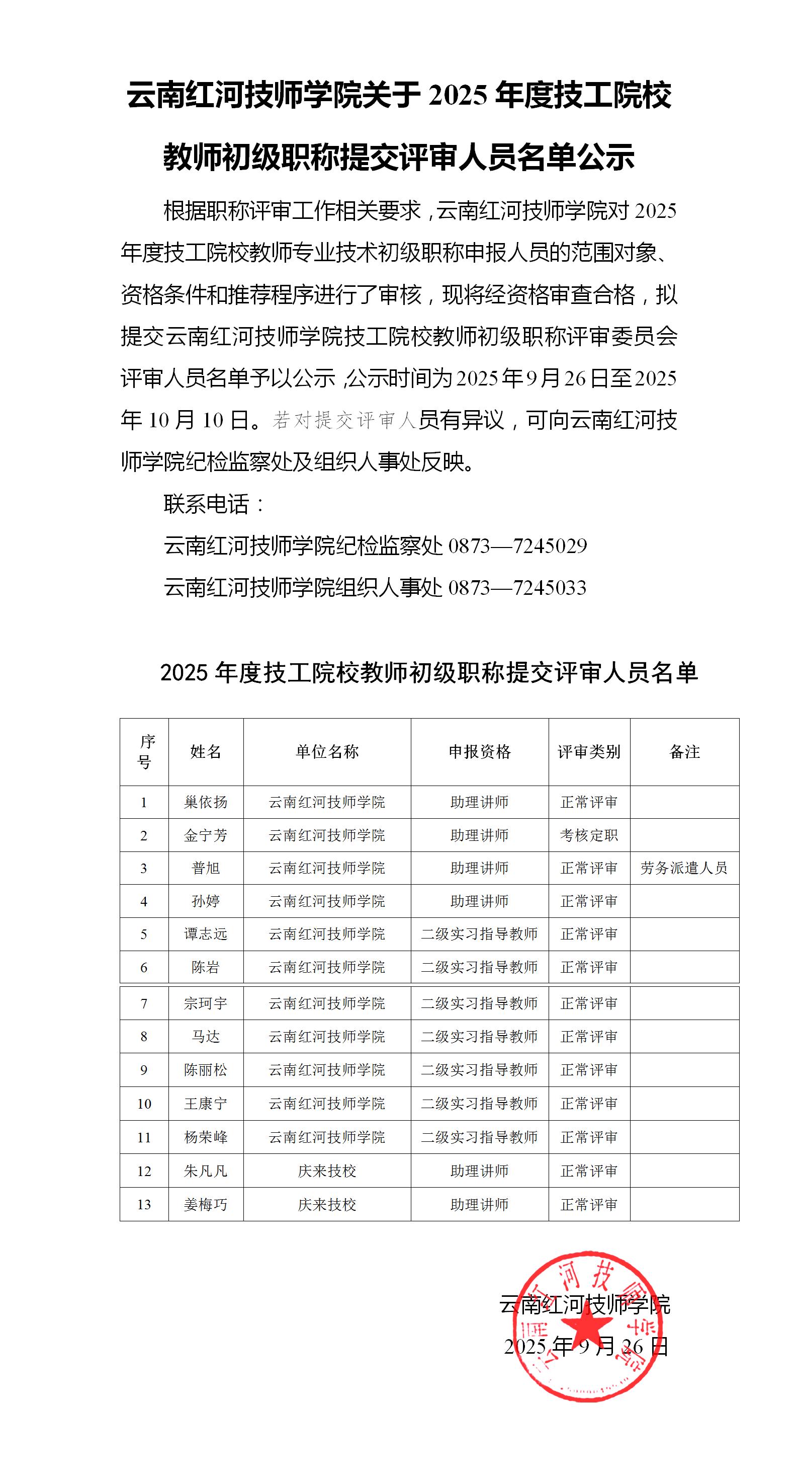 云南红河技师学院关于2025年度技工院校教师初级职称提交评审人员名单公示