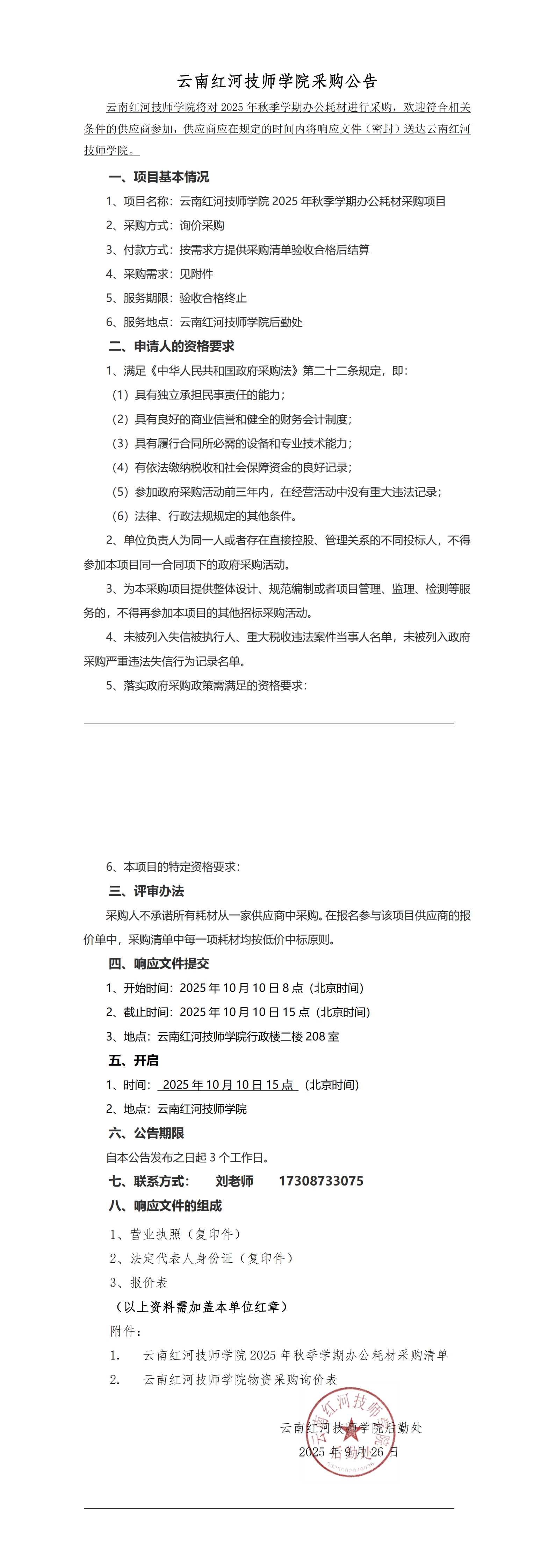 云南红河技师学院2025年秋季学期办公耗材采购公告.zip