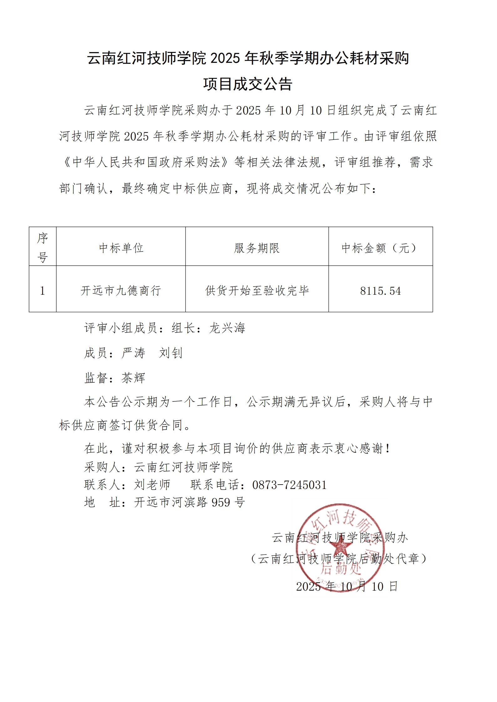 云南红河技师学院 2025 年秋季学期办公耗材采购 项目成交公告