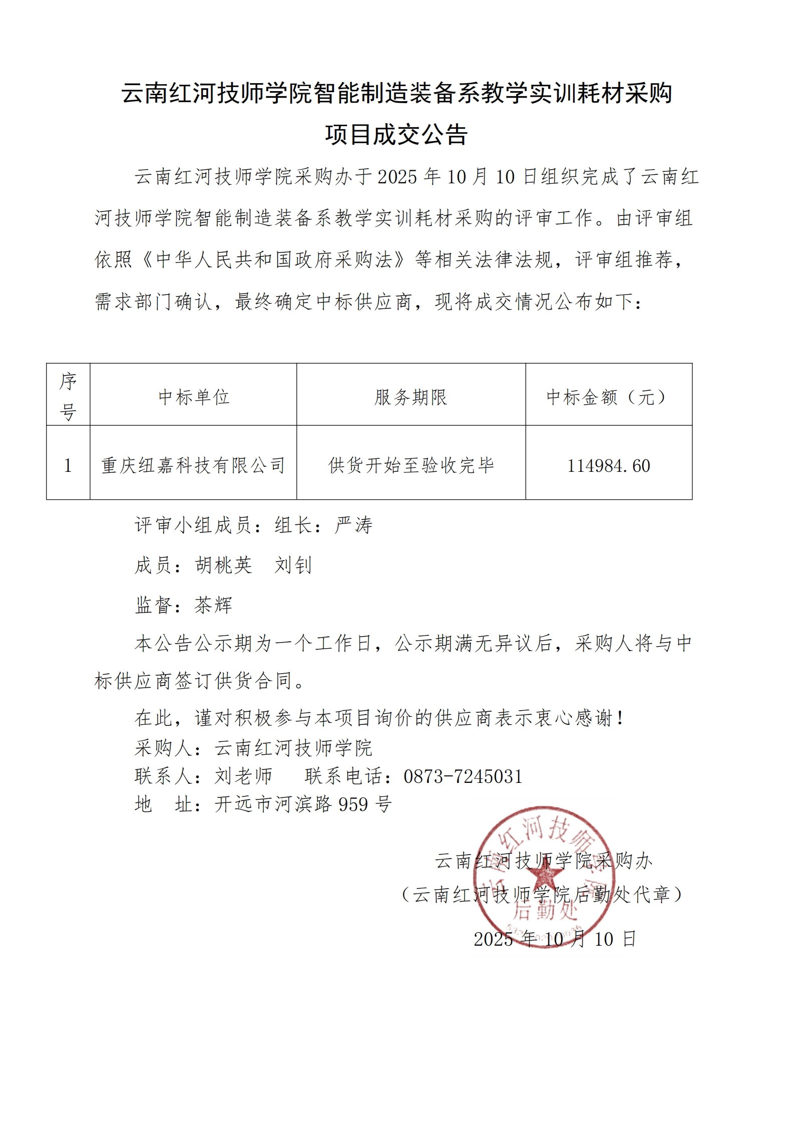 云南红河技师学院智能制造装备系教学实训耗材采购 项目成交公告